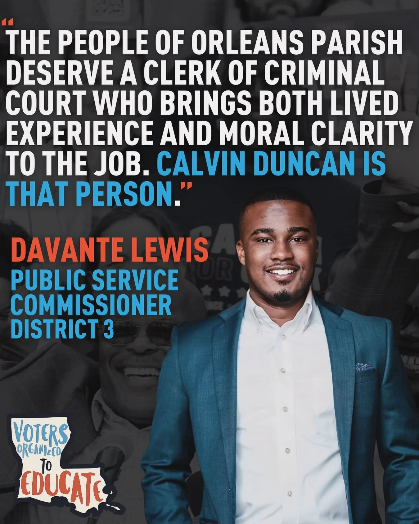 Voters Organized to Educate is a non-profit focused on building collective power to create change in the criminal legal system. We are dedicated to building an educated and engaged democracy. We do this by keeping people informed regarding elections, and ongoing issues in city, state, and national policy reform. Through working with organizations and individuals that believe in the principles of social justice and equality, Voters Organized impacts elections and legislation in Louisiana and beyond. We educate and mobilize organizations and individuals that believe in the principles of grassroots movement building, social justice, and equality.