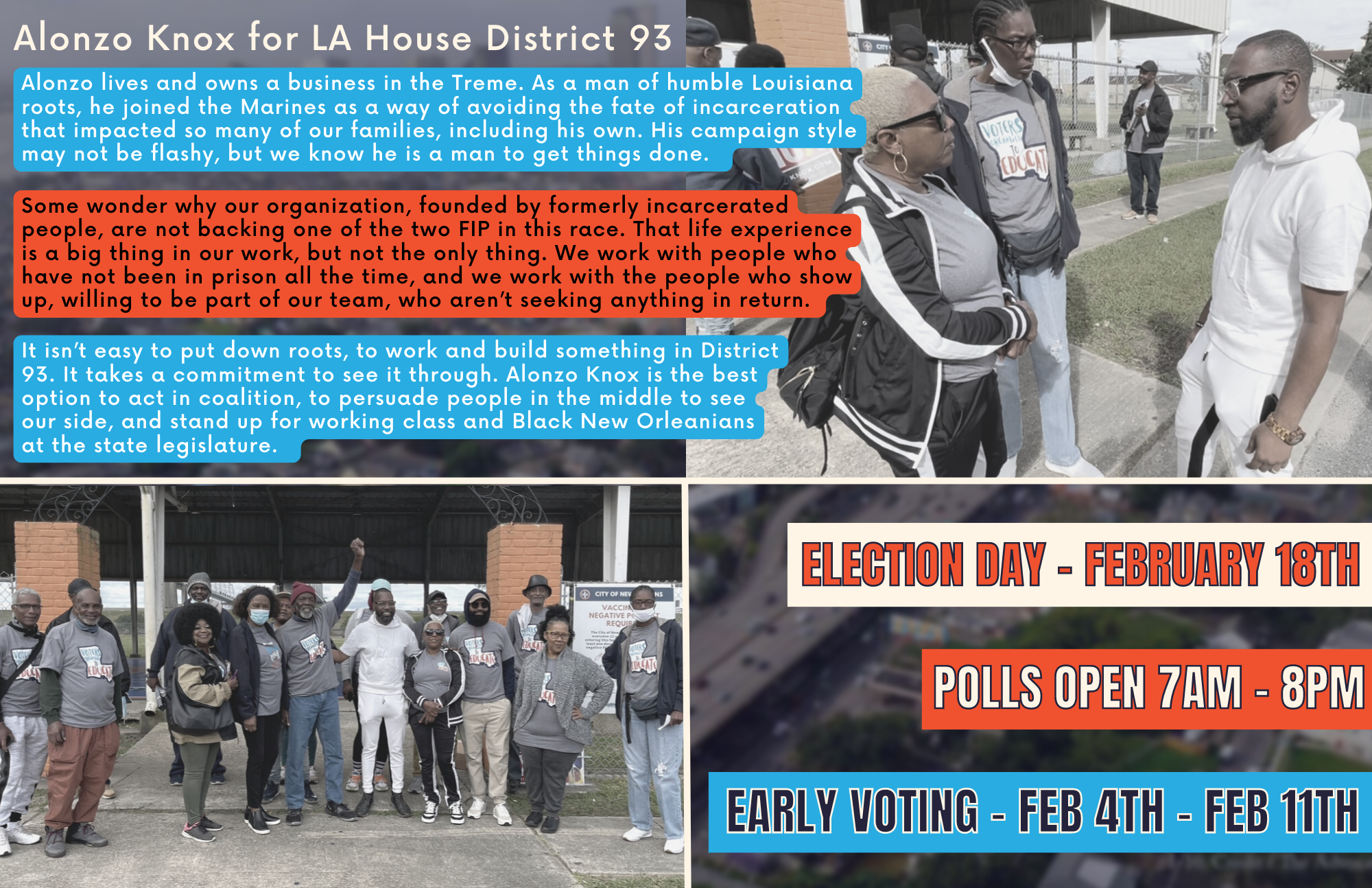 However, demographics alone should never be the sole reason to vote for someone. We wish all the candidates the best in their careers, but in this election, we are turning to Alonzo Knox. We have no doubt that there will be formerly incarcerated people representing us in the Legislature very soon, and this is one reason we will be launching a candidate school in the coming months.